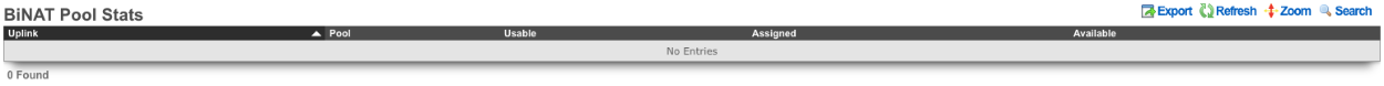 The BiNAT Pool Stats table lists the current state of any configured BiNAT pools. Uplink lists the uplink the IP addresses of the BiNAT pool belong to. Pool displays the name of the BiNAT pool. Usable lists the number of usable IP addresses in the pool. Assigned displays the number of addresses that have been assigned in the pool. Available displays the remaining number of IP's that are available to be assigned for BiNAT.