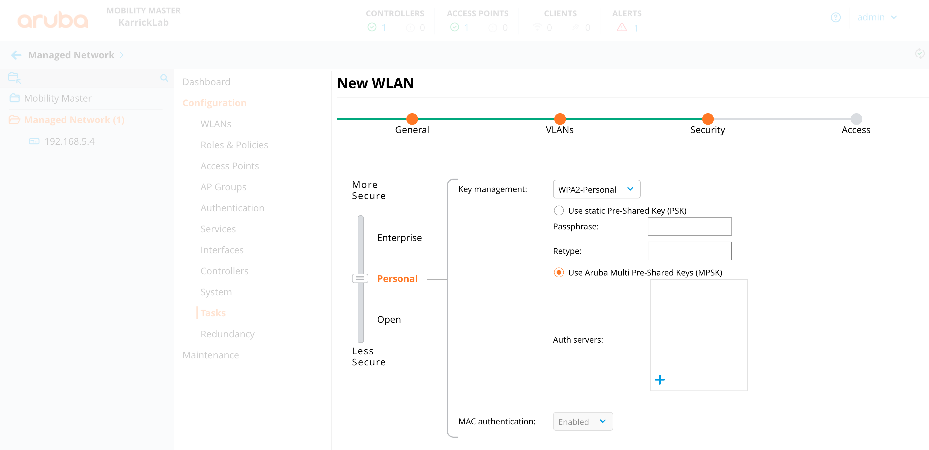 Follow manufacturer guidelines for deployment, and licensing, of Aruba Networks Mobility Master. MPSK is only available with a MM.