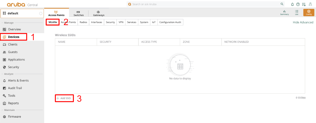 Click on devices, which will take us to the WLANs section. Click Add SSID