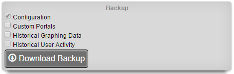 To back up the configuration, simply click on the download link. When clicked, the button will start a download process, resulting in the web browser prompting a download destination for the configuration to the administrator's computer. Save the backup file in a secure location, as the file may contain sensitive information about the end-users of the network that the rXg manages.