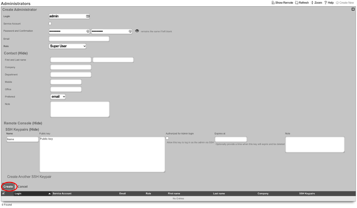 The login and password fields are the credentials that identify an individual administrator. No administrators should be aware of the credentials of any other administrator. When creating a new administrator, the password must be entered twice for confirmation.