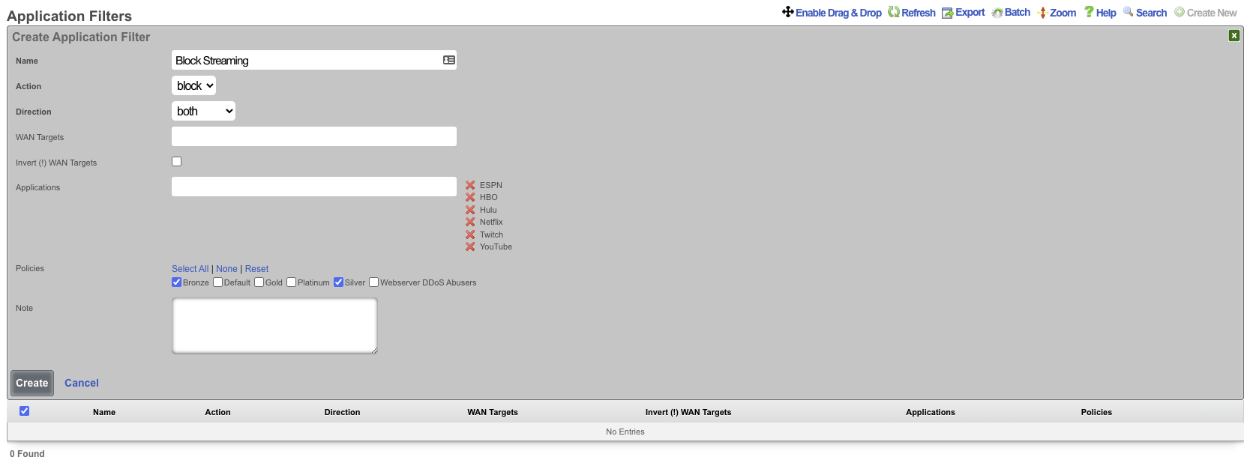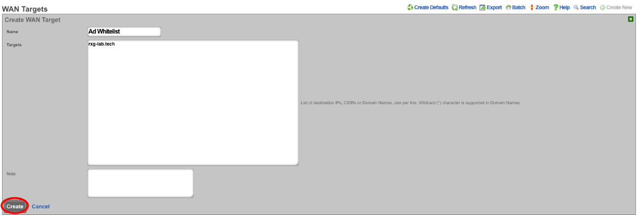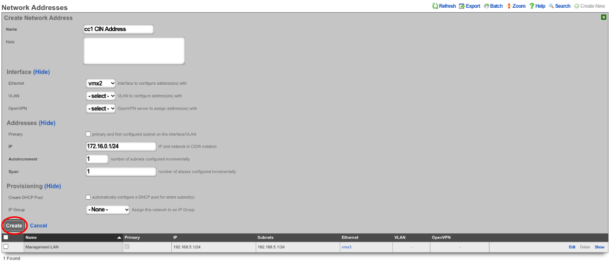 In the rXg GUI, browse to Network >> Wireless >> WLAN Controllers and click Create New. Update the fields below to use the information you collected in step one and click create.