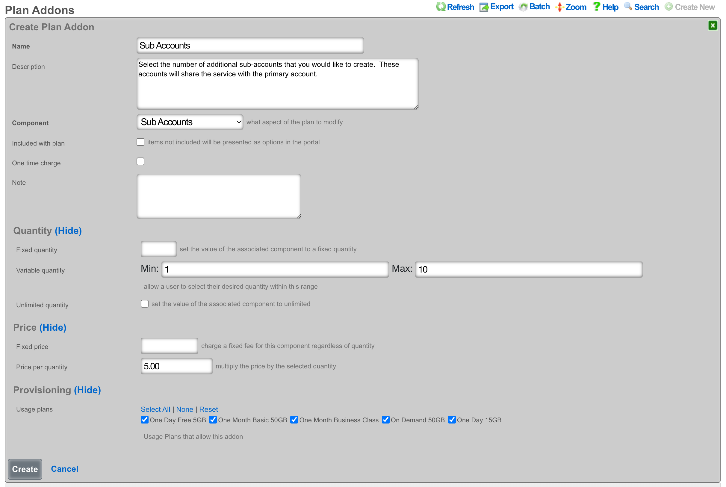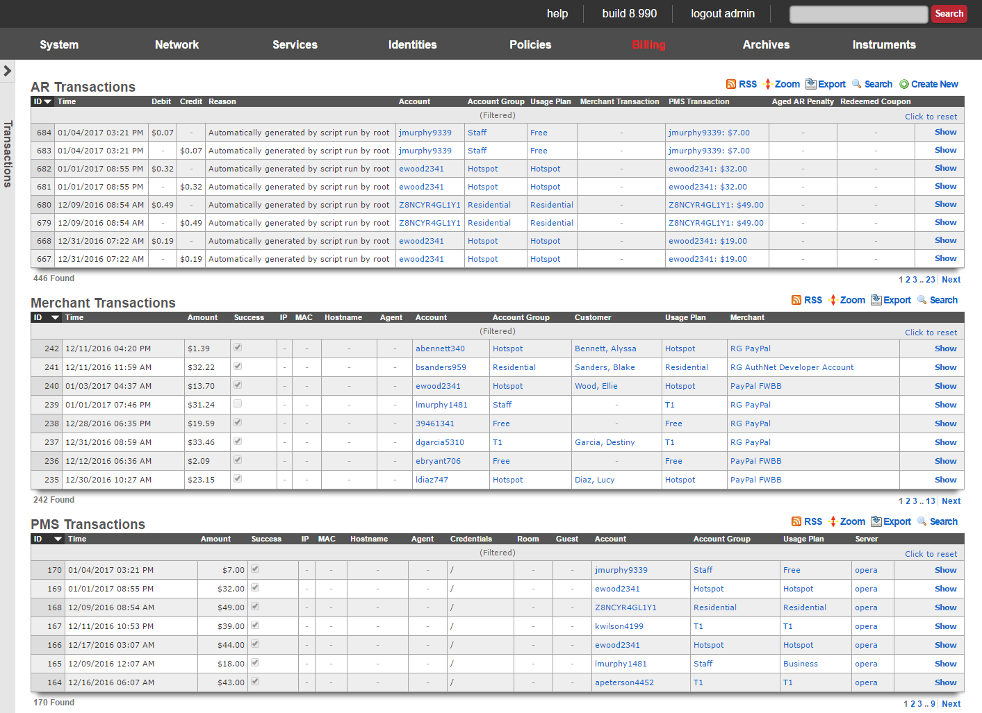 The billing permission authorizes control over configuration options and log retrieval for the rXg accounting mechanisms. Management of access and usage plans, download quotas, recurring billing, and other accounting related activities are governed by this permission.