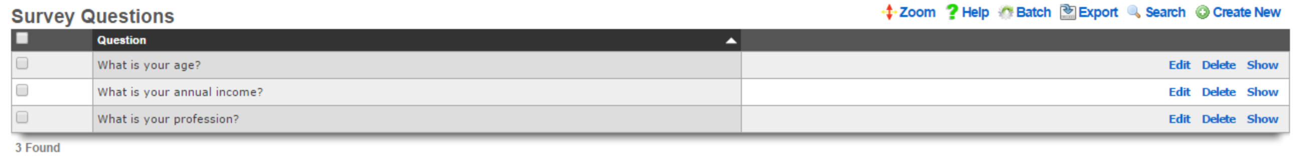 Screen space limitations dictate that a reduced set of fields be present in the list view. Using the show link gives access to the other fields stored in the record. In addition to payload fields, meta-data fields such as the create and last update time, as well as the creator's administrative login and last updater may be seen in the detailed display.