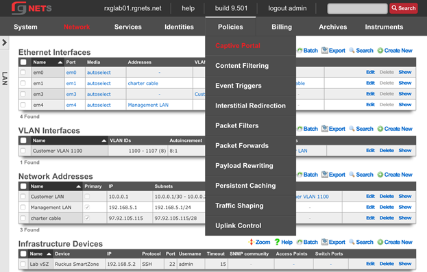 The primary mechanism used to navigate within the rXg administrative console is the menu at the top of each page. The menu is present at the top of all views of the console and allows quick access to all functionality.