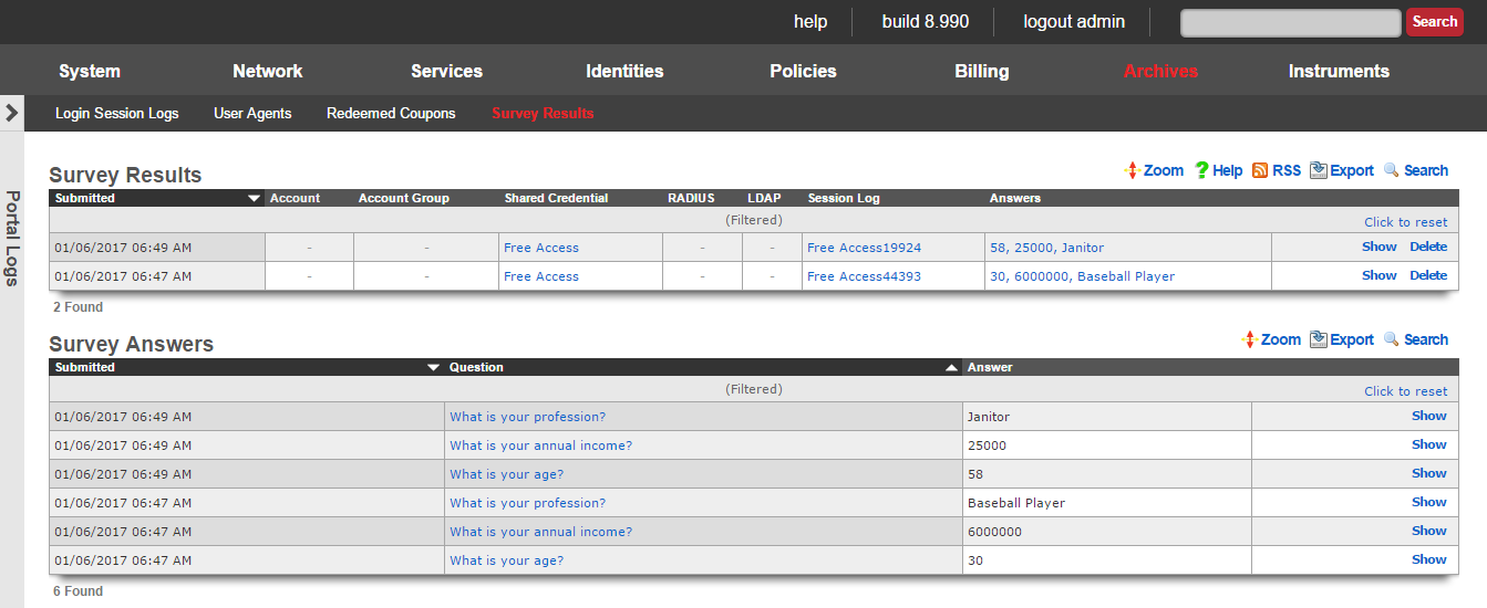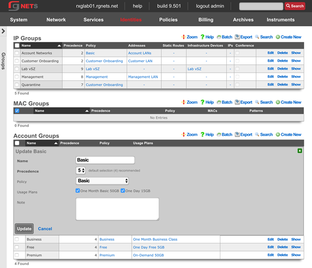 The rXg administrative console implements all five tenets of a trustworthy system. Three of the five tenets (authentication, authorization and non-repudiation) are controlled on this view.