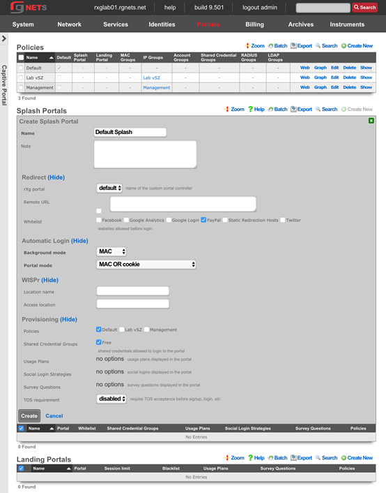 A WLAN must exist that matches the SSID of the WLAN in the Aruba controller, the rXg can import this information by creating a WLAN Controller. Configure a WLAN Controller by navigating to Network::Wireless and click create new on the WLAN Scaffold. This will allow the rXg to import the WLAN's from the Aruba controller.