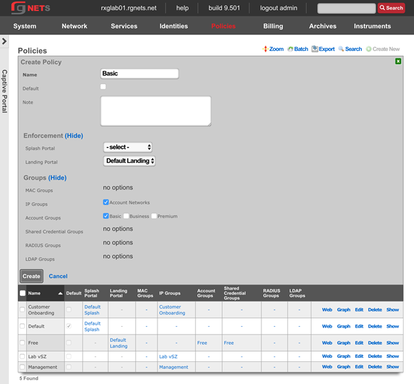 The Administrative Roles scaffold enables creation, modification and deletion of authorization policies that govern authenticated administrators within the rXg administrative console.