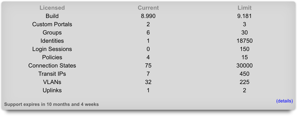Click on the details link to navigate to the License view of the administrative console to update the license key. Further information about the purpose and restriction of the parameters listed may be found on the manual page for the License view.
