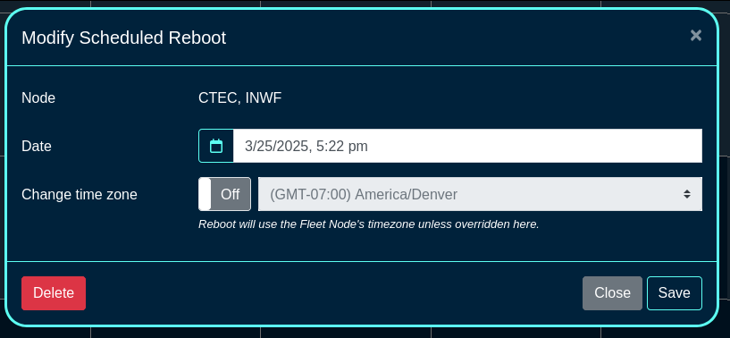 The reboot option will cause the rXg to power cycle. This is useful if the rXg is behaving erratically after an abnormal condition such as overflow of the persistent storage device.