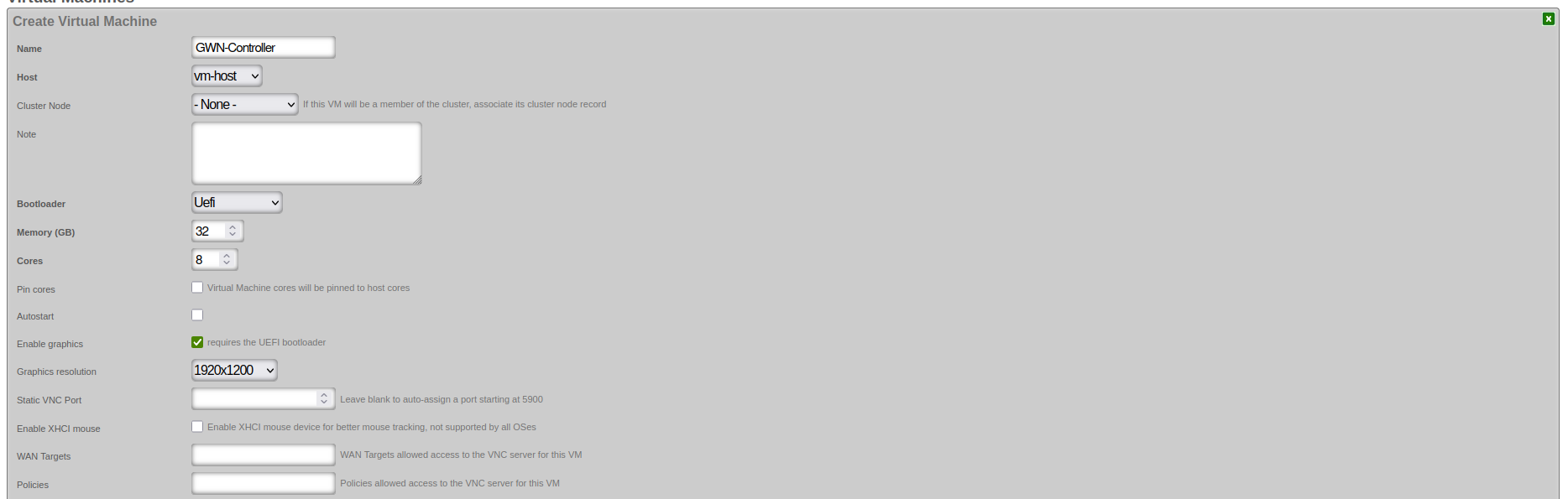 - Enable graphics: Required for graphical VNC console access via the scaffold. This option may only be enabled for VMs using the UEFI bootloader. Note that CLI console access is always available via vm console <vmname> from the rXg CLI regardless of this setting.
