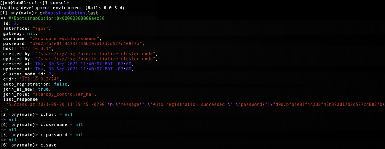 SSH into the node that will be the new master. Run ' console' to access the rails console. Find the BootstrapOption record for the NEW master and set the host , username , and password fields to nil. In this case, the record that will be edited is the last record, since there is only CC1 and CC 2. The record can be found by running ' BootstrapOption.last'.