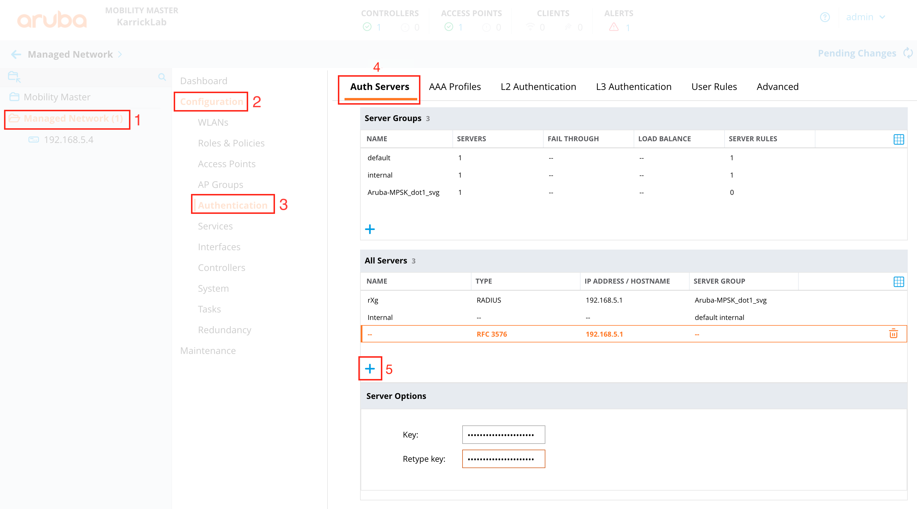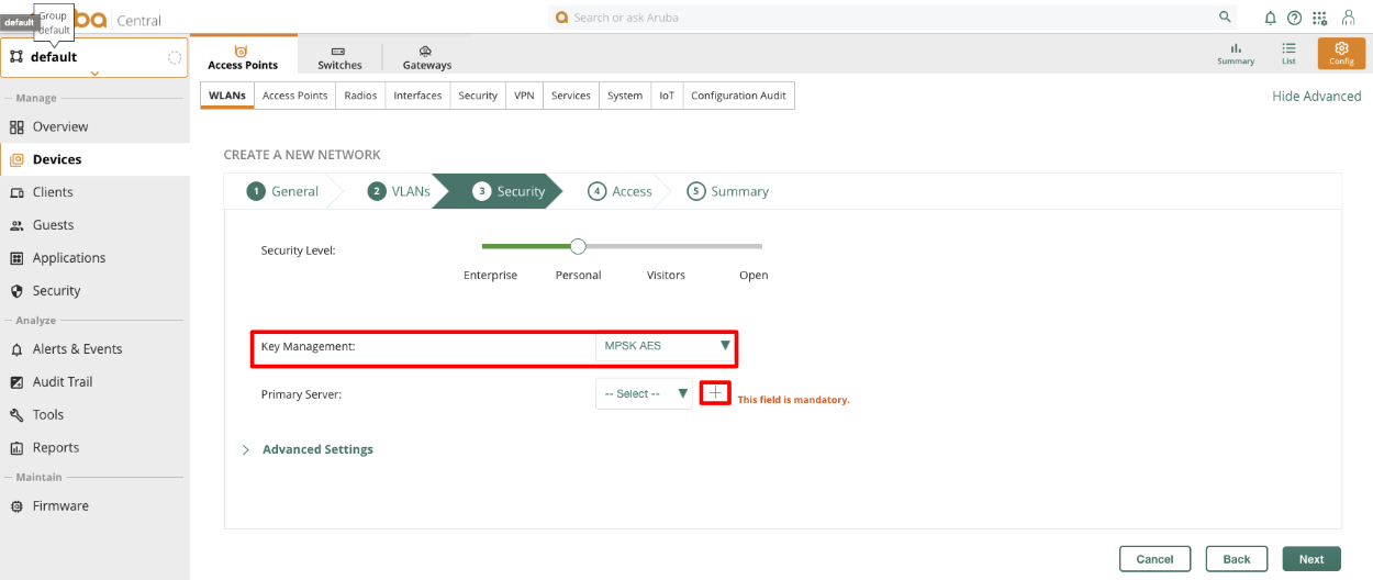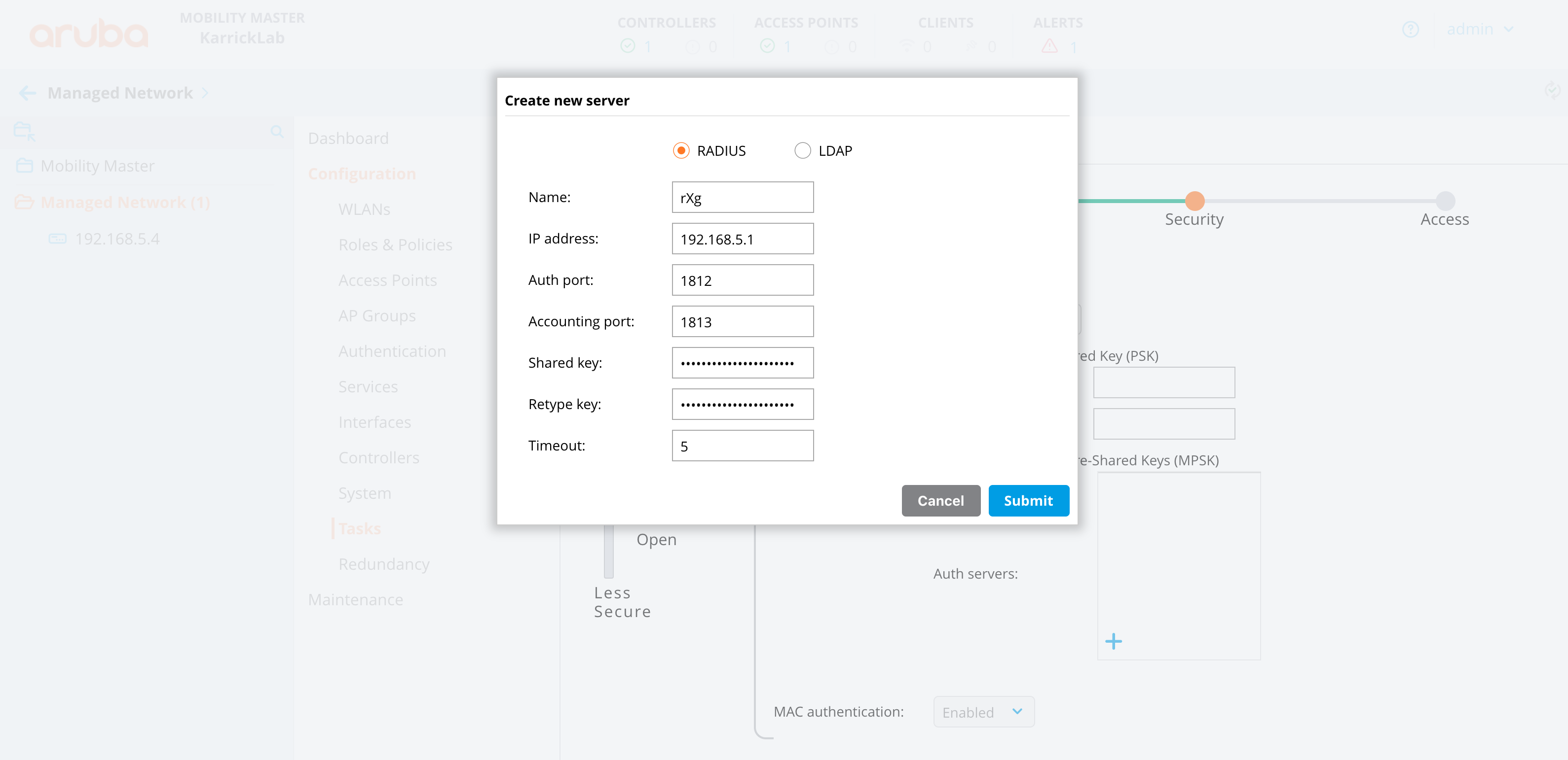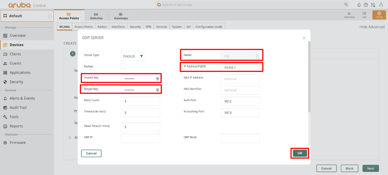Change Key Management to MPSK AES.Click the + in the Primary Server field, give the Server a name, and copy the shared secret from the Radius Server Options to the Shared Key and retype Key fields. Set the IP field to the IP Aruba Central will talk to the rxg on, and click OK. The Shared Secret can be obtained by navigating to Services::Radius in the rXg.