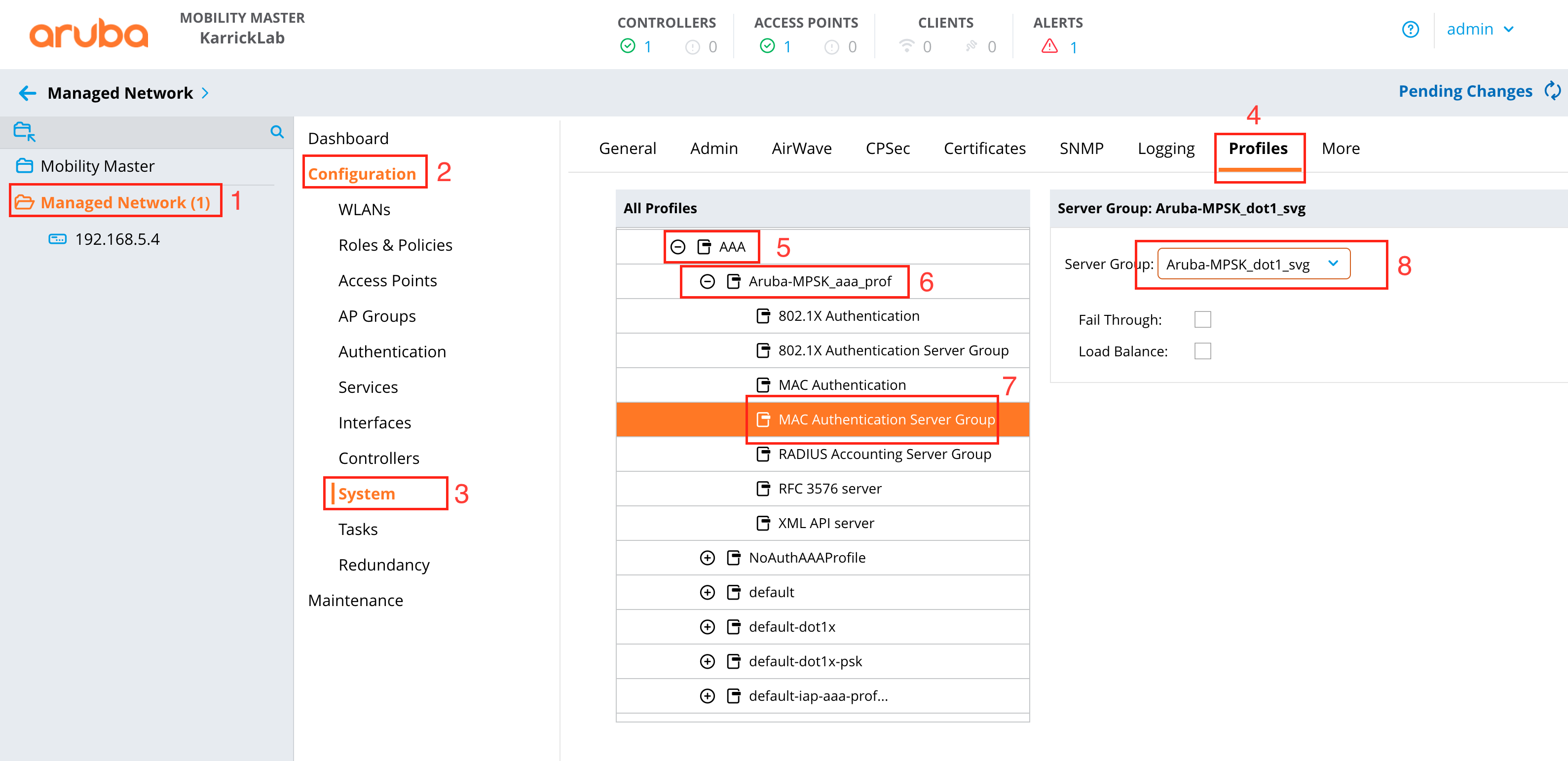 - From the group hierarchy level go to configuration -> system -> profiles -> Wireless LAN -> AAA -> (wlanname)_aaa_prof -> MAC Authentication Server Group -> set to the (wlanname)_dot1_svg group that got created from the mpsk IEEE Std 802.1X settings
