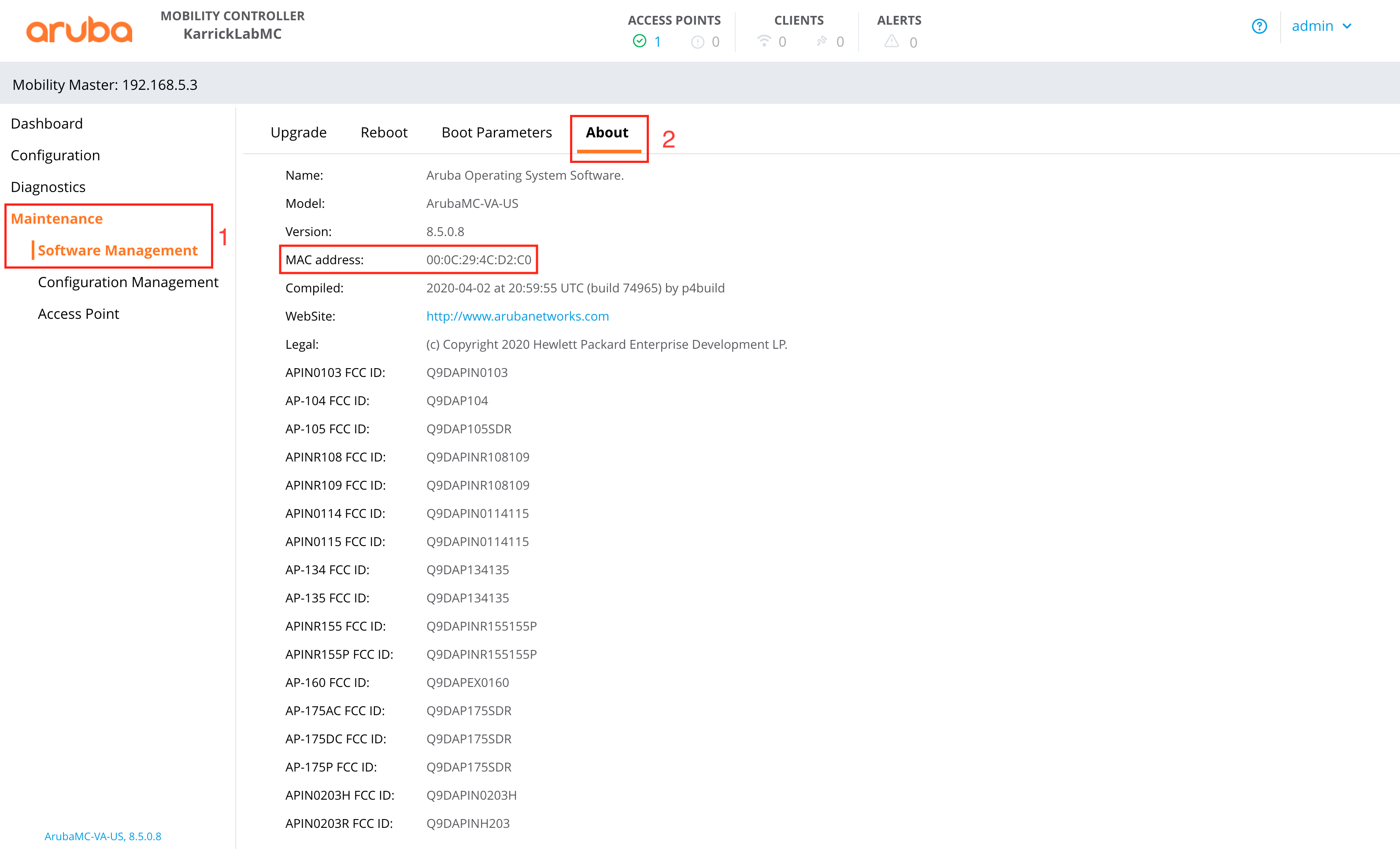 Locate the MAC address of the Mobility Controller by logging into the MC GUI, or running