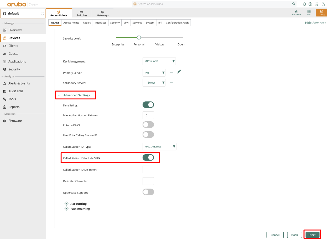 Expand advanced settings and enable "Called station ID include SSID" Click next.