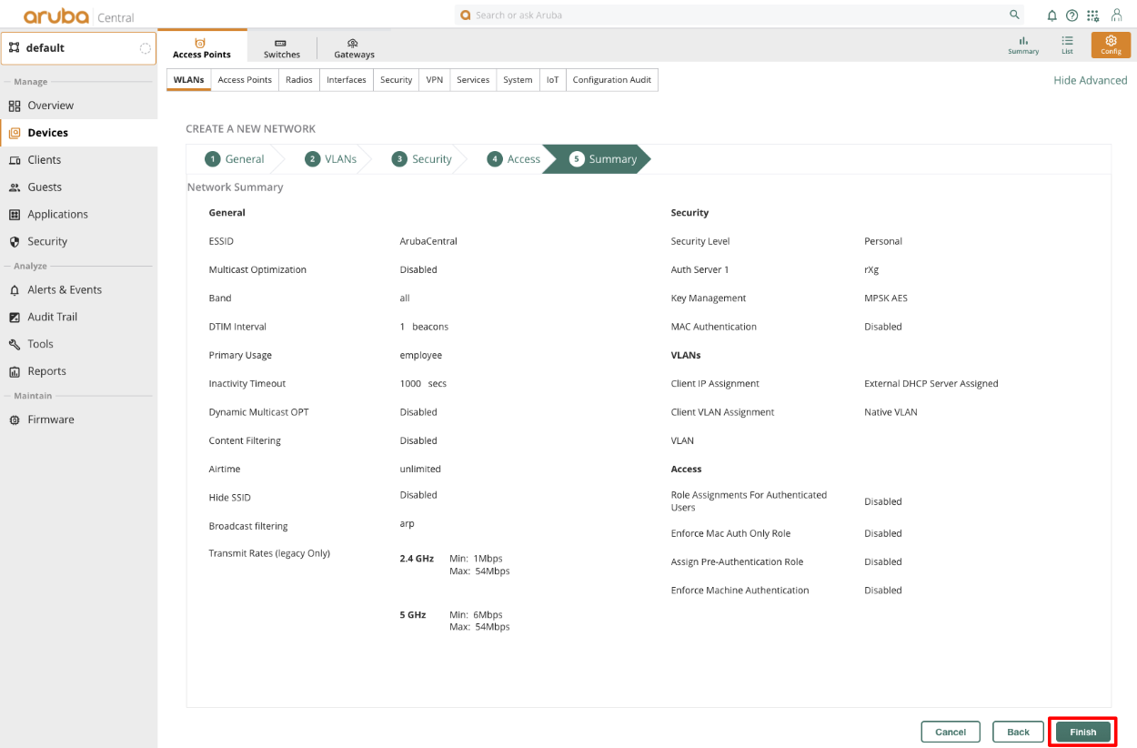 Verify settings in the Summary view and click Finish. Note that with Aruba MPSK it is required that a devices MAC address be present in an account for the MPSK to work on any given device.